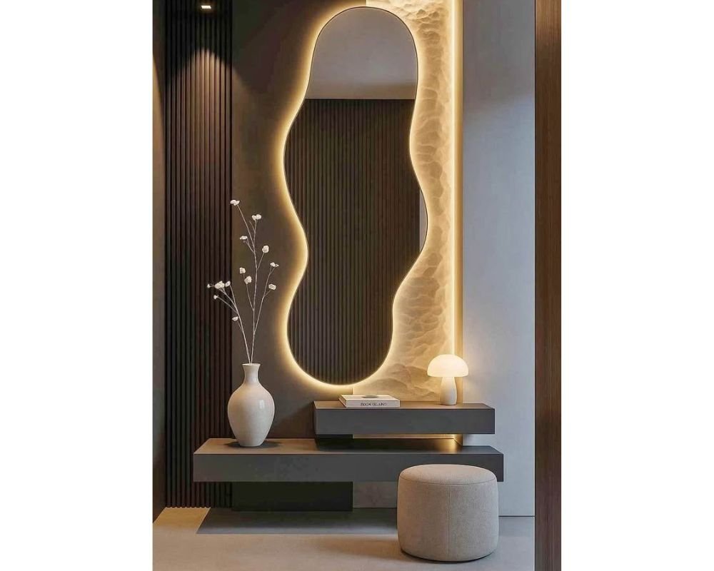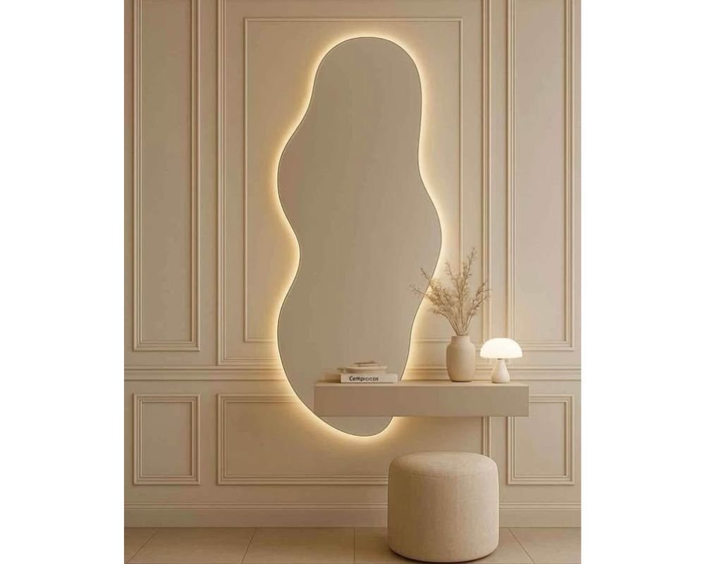 Be the first to review “Asymmetrical mirror with LED lights. 5.2ft x 2ft Irregular designer floating mirror 1400x400mm” Cancel reply