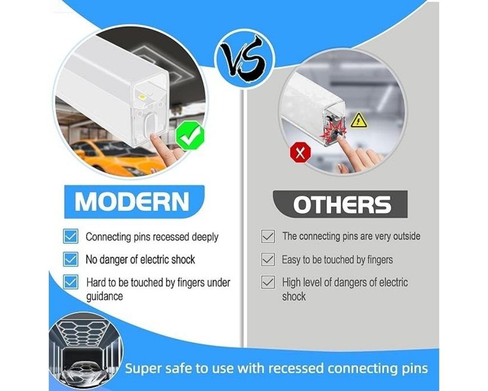 - 【Premium Materials】 Integrated housing and no wires exposes, can avoid electricity leakage and be safer. The hexagon garage tube’s body is made of high quality PC materials that it is totally insulated, which keep you in a super safer position. Equipped with LM-80 SMD 2835 led chips, this plug and play garage light has excellent light transmittance, saves 70% more energy than traditional lamps and can give off a natural white light that is ideal for your garage.