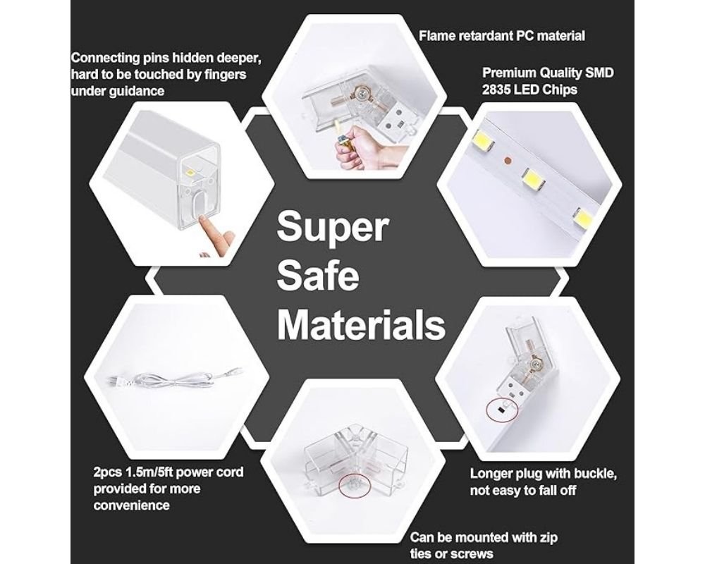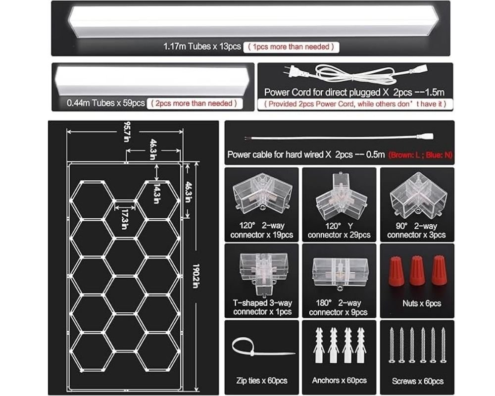 - 【More Accessories】 The whole set of car hexagon garage light contains light tubes and accessories, tubes including 57pcs 0.44m(17.32inch) to make the hexagon grid system and 2pcs extra light tubes for replacement if needed;12pcs 1.17m(46.06inch) to make the rectangle frame and 1pcs extra light tube for replacement if needed. Much more accessories than other and you can check them on the advertised picture.