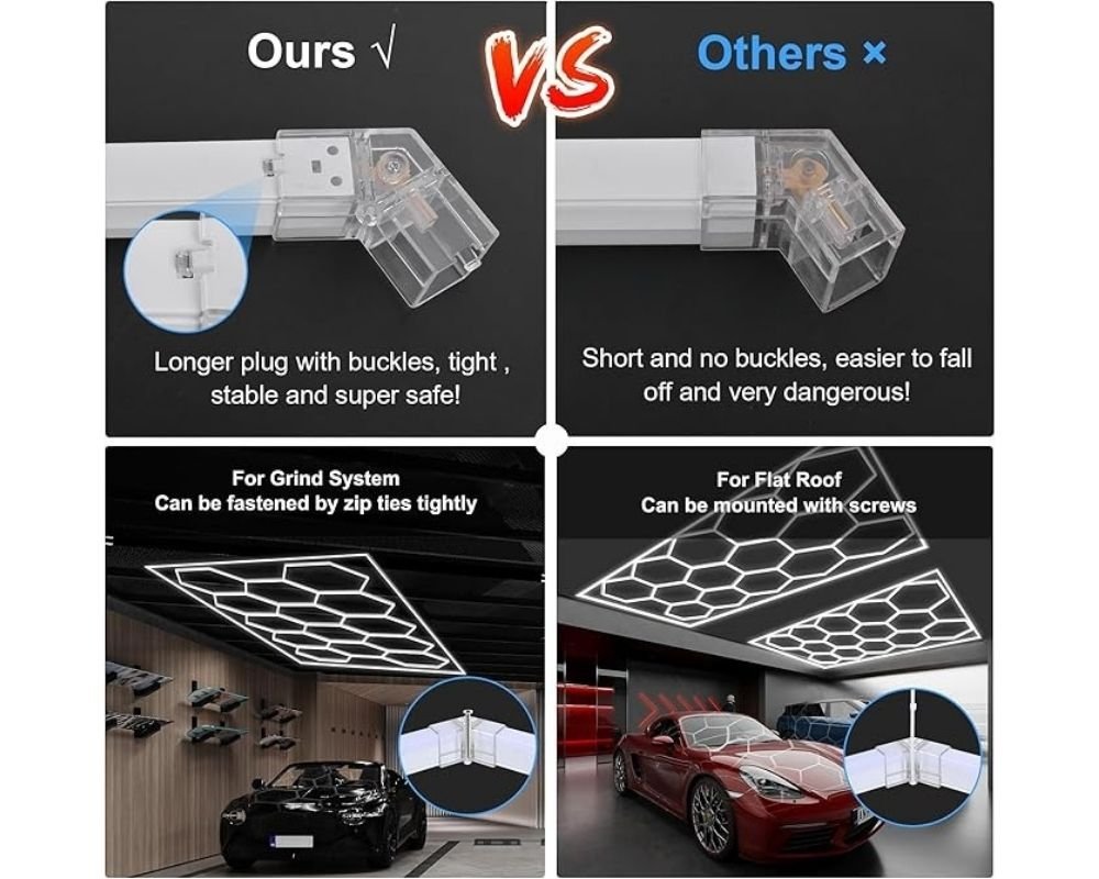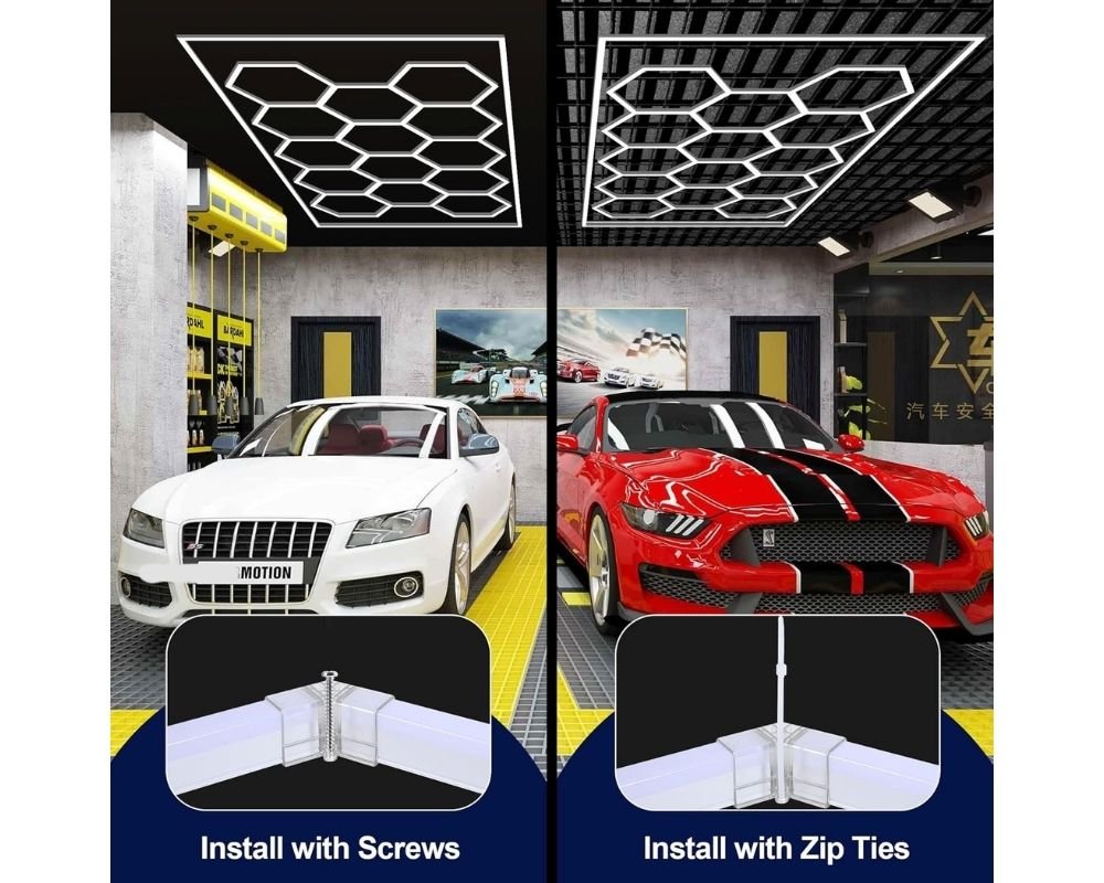 - 【Easy Installation】 Your hexagonal garage light can be mounted in two ways, using either zip ties or screws, depending on your specific needs and preferences. This flexibility allows for easy installation and customization, so that you can choose the method that works best for your garage spaces. Whether you prefer a more permanent mounting option with screws or a more flexible approach with zip ties, our hexagonal garage light is designed to accommodate your unique preferences and requirements.