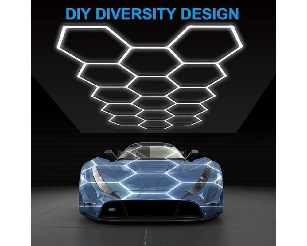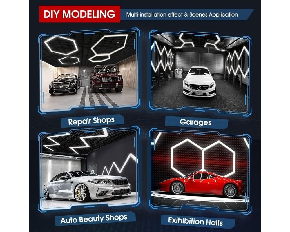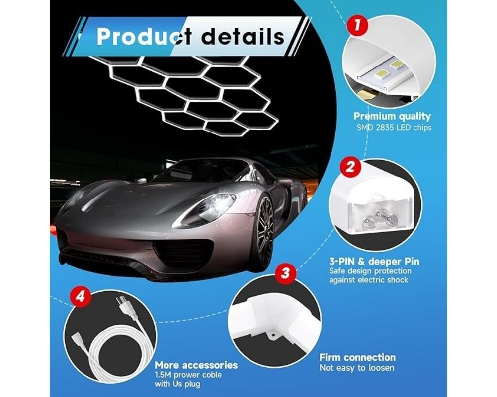- 【Super Bright】Using More high quality LED inside, this car detailing hexagon light system produce 110 lumens per watt, up to 26400 lumens. Light color is 5000K(Nature white) which is the best color temperature for daylight using, providing the best car lighting experience .Total 240W. “CRI >85” which will make your garage or work bench looks very good and bright.