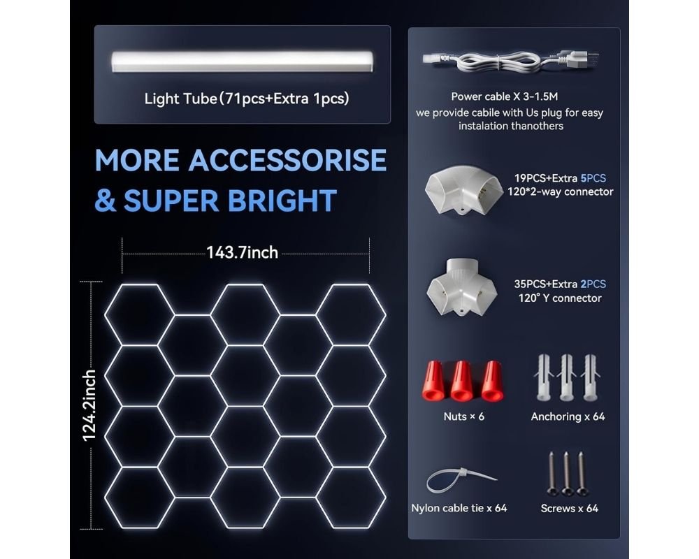 - 【Easy Installation & More Accessories】By providing Y/V connector, this car detailing light can be easily be assembled and make different style. You can buy more sets to assemble a bigger hexagon light if you want, super DIY choice. Every set ,we provide MORE accessories than others : One 5TF long power cable with US plug ; One power cable for hard wired; 25pcs led tube(one more than needed) ;12pcs V connector(one more than needed) ; 10pcs Y connector(one more than needed) and other accessories like screws and so on .